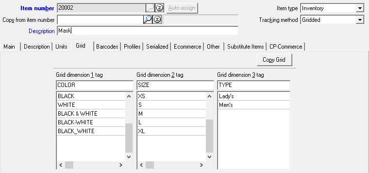 On the left, you'll see the item setup in Counterpoint with the grid dimensions.