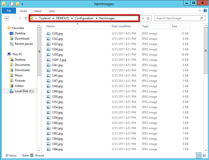 Locate your CounterPoint installation's ItemImage Directory - From here navigate toTop-Level → YOUR CP DB NAME → Configuration → ItemImages. (In the example below, we are using DEMOLIQ as the name of our CP DB).