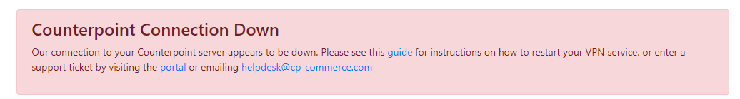 Counterpoint Connection Down: The sync has lost the connection to Counterpoint, and will not be able to access information from it. Check the linked guidehere.