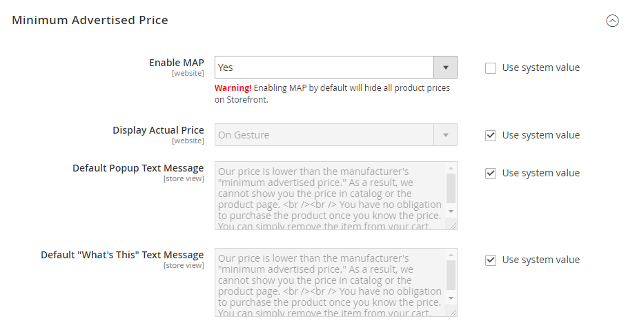 Enable MAP- This must be set to Yes to apply MAP on the front end, regardless of what individual item configurations are defined. As noted in the warning shown in the screenshot, this will serve as a general rule to hideALLprices on the front end by default. If you only want to hide prices for certain items, refer to the Product Price Configuration below.